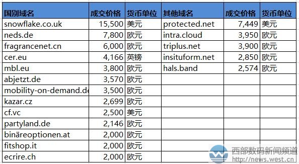 国别域名方面,英国域名snowflake.co.uk以15,500美元成交,约合人民币10万元。域名Snowflake.co.uk虽然字符较长,后缀又是长尾域名,但胜在含义通用。前缀snowflake是“雪花”的意思,在全球都是比较常用的词,加上没有特别的行业趋向性,所以应用空间广泛,市场价值不错。 其他域名方面,protected.net(保护)以7,449欧元结拍,约合人民币5.7万元。另外,两个新顶级域名intra.cloud(内部云)和hals.band(柏林住房)分别以3950和2574欧元的成交价上榜。 本文转载自新闻资讯,原文链接:“礼物”域名12万元领衔!韩国最大比特币交易所买走korbit.com?