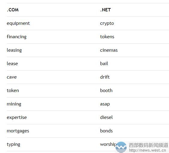 .com方面,“equipment”(设备,器材、配件)力压众多关键词一举成为最受欢迎的.com域名注册词汇。Equipment除了对应有知名法国服饰品牌以外,本身还可以与多个行业多诸多词语组合,可应用的领域非常广。 随后是“financing”(融资、理财),作为一个金融类词语,与此相关的域名可用来搭建投资理财等终端平台。同样属于金融行业词的还有 “mortages”(抵押贷款),相关域名用来搭建抵押借贷平台比较合适。 另外,两个有着“租赁”之意的词语“leasing”和“lease”也成为6月份的注册热词,可用于汽车、房产等多个行业租赁平台。除此以外,“token”(代币)、“mining”(采矿)、“cave”(洞穴)、“typing”(打字)均成为6月热门注册词汇。 .net方面,两个虚拟货币类词语“crypto”(加密货币)、“token”(代币)是6月最受欢迎的注册词汇。今年以来,虚拟货币行业的疯狂发展,不仅使得相关域名成交价水涨船高,也催生了大批域名渊源不断的被注册。 随后,“cinemas”(电影院)一词在本月注册量也极大,近年来,全球影视市场风起云涌,不少大佬纷纷进军电影领域,加上今年大片不断,“电影院”人气高涨。 除此以外,“bail”(保释金)、“drift”(漂泊)、“booth”(售货棚)等词也榜上有名。 本文转载自新闻资讯,原文链接:威瑞信6月月报:虚拟货币热度不减!“crypto”再成最受欢迎域名关键词