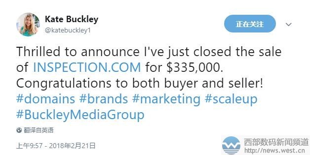 2月22日消息,昨天早上域名销售公司Buckley MediaGroup CEO在推特上曝料称,域名Inspection.com以335,000美元达成交易,约合人民币212万元。经查询发现,该域名背后买家乃是亚检质量检测有限公司Asia Inspection。