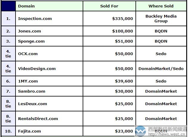 “检测”域名7位数登顶DN榜!人名“琼斯”63万元易主!2月22日消息,据新一期的DN交易榜(2.12-2.18)显示,由BuckleyMediaGroup以335,000美元达成交易的英文域名inspection.com登顶DN榜;同样以六位数美元成交的域名Jones.com则排在第二。